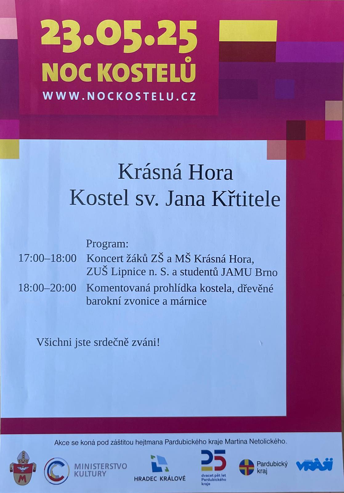 Srdečně Vás zveme na Noc kostelů v kostele sv. Jana Křtitele v Krásné Hoře, kde se uskuteční koncert žáků ZŠ a MŠ Krásná Hora, ZUŠ Lipnice n.S. a studentů JAMU Brno. Po koncertě si budete moci prohlédnout kostel, márnici i zvonici.